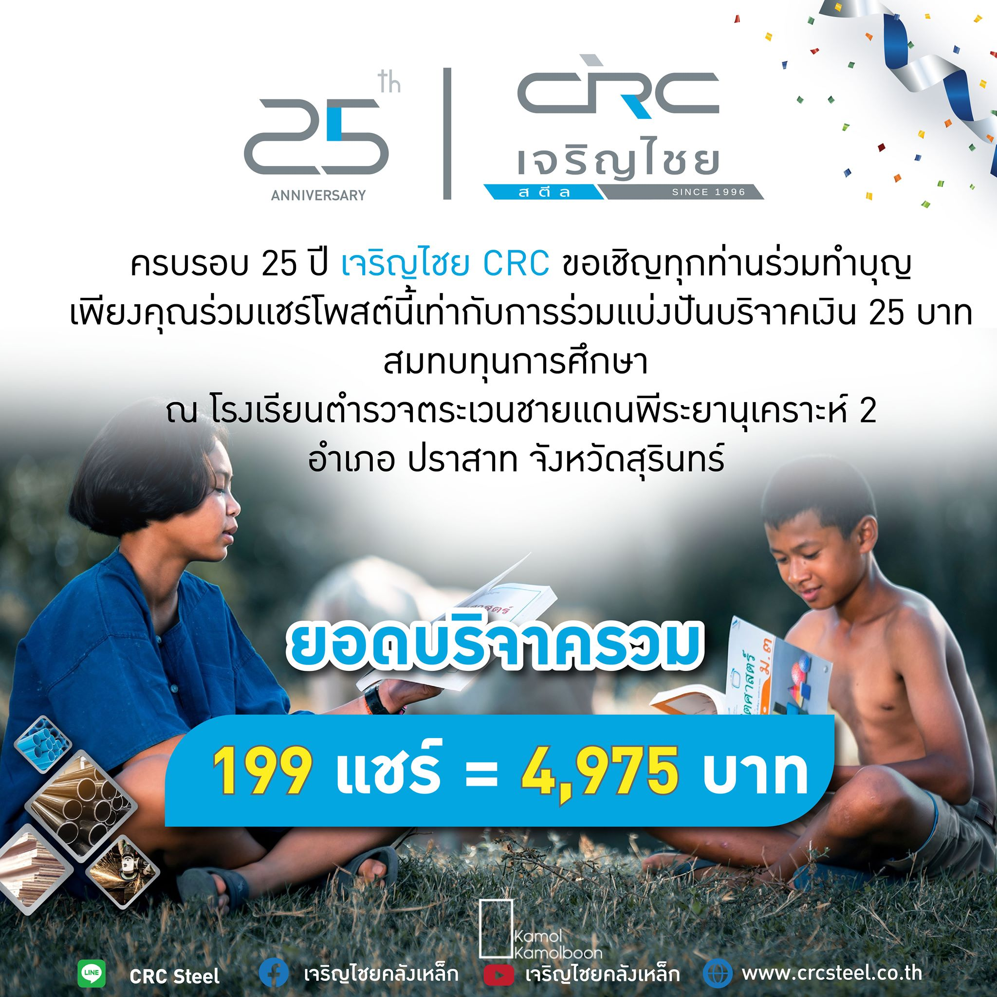 และเงินทุนการศึกษาจากกิจกรรม 1 แชร์ = เงินบริจาค 25 บาท ผ่านเพจเฟซบุ๊ก “เจริญไชยคลังเหล็ก ” ทั้งหมด 199 การแชร์ เป็นเงิน 4,975 บาท มอบให้โรงเรียนตำรวจตระเวนชายแดนพีระยานุเคราะห์ 2 อำเภอปราสาท จังหวัดสุรินทร์
