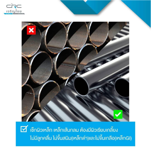 3.เช็คผิวเหล็ก เหล็กเส้นกลม ต้องมีผิวเรียบเกลี้ยง ไม่มีลูกคลื่น ไม่ขึ้นสนิม(เหล็กดำ)และไม่ขึ้นเกลือ(เหล็กGI) เหล็กเส้นที่ดีต้องไม่เป็นสนิมขุม เพราะสนิมขุมจะกินเข้าไปในเนื้อเหล็ก ทำให้ความแข็งแรงของเหล็กลดลง ในขณะที่สนิมผิวสามารถเกิดบนผิวเหล็กได้ ไม่เป็นอันตรายต่อการใช้งานและกำลังรับแรงดึงของเหล็กเส้น